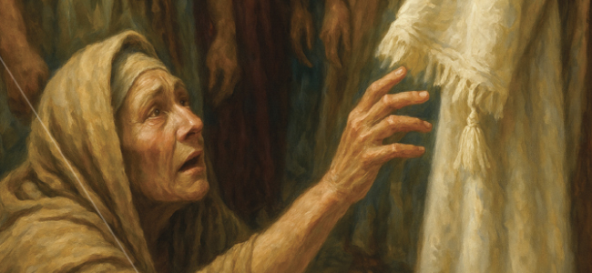 “They advanced but slowly; for the crowd pressed Christ on every side. In making His way through the multitude, the Saviour came near to where the afflicted woman was standing. Again and again she had tried in vain to get near Him. Now her opportunity had come. She could see no way of speaking to Him. She would not seek to hinder His slow advance. But she had heard that healing came from a touch of His garments; and, fearful of losing her one chance for relief, she pressed forward, saying to herself, ‘If I may but touch His garment, I shall be whole.’